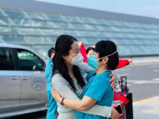 5月25日,虹橋火車站,上海浦南醫院血透室護士長姚春英依次擁抱威高援滬血透醫療隊隊員,道別的話語中滿是感謝與不舍。