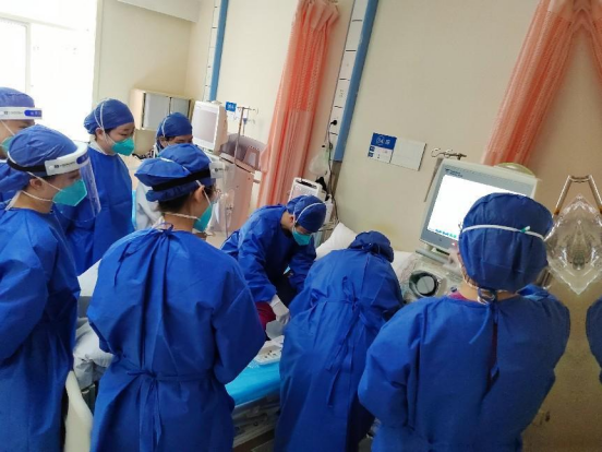 “不好,這位患者沒有意識了!”還沒等量完血壓,患者就出現異常,意識昏迷。李曉陽馬上進行救治,身著防護服沒辦法把聽診器插到耳朵里,非常影響判斷,于是他就一邊心臟聽診,一邊摸脈搏。