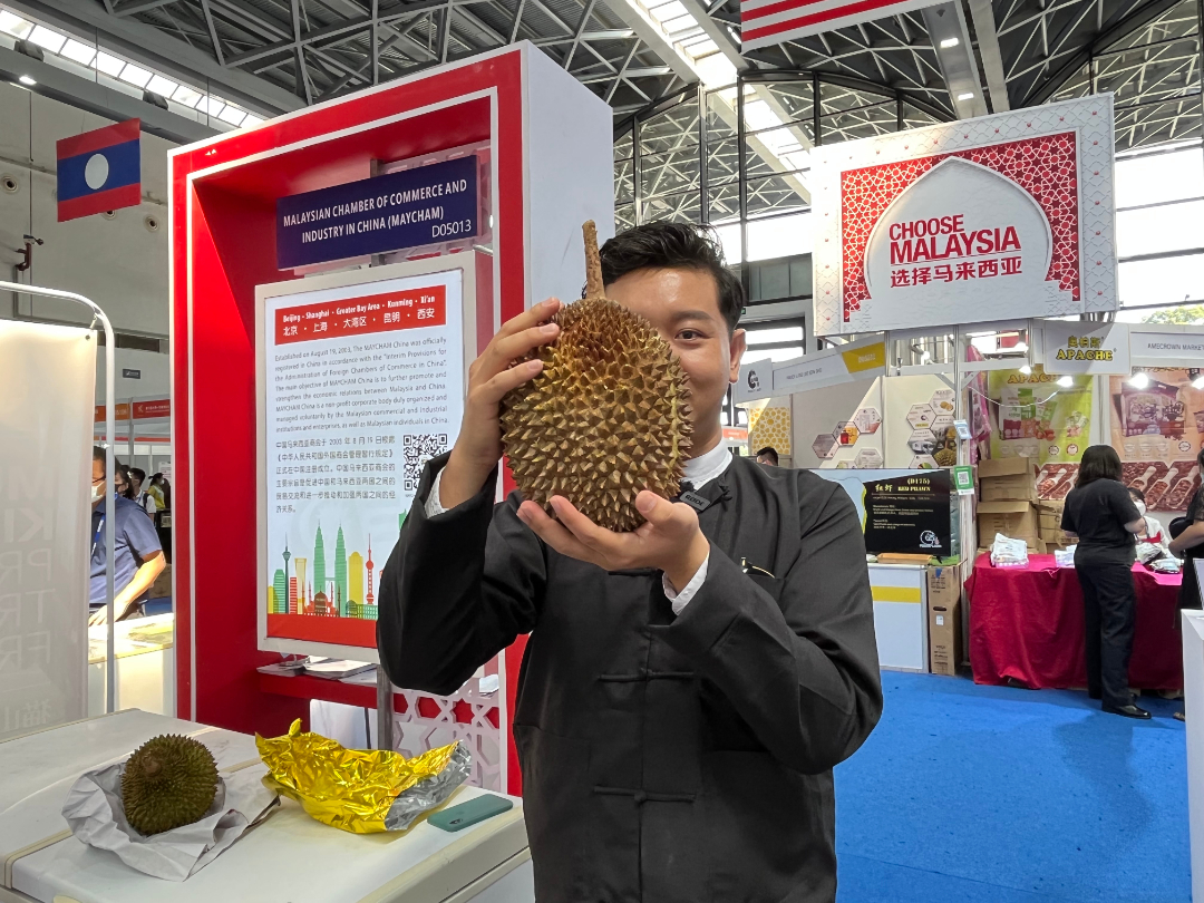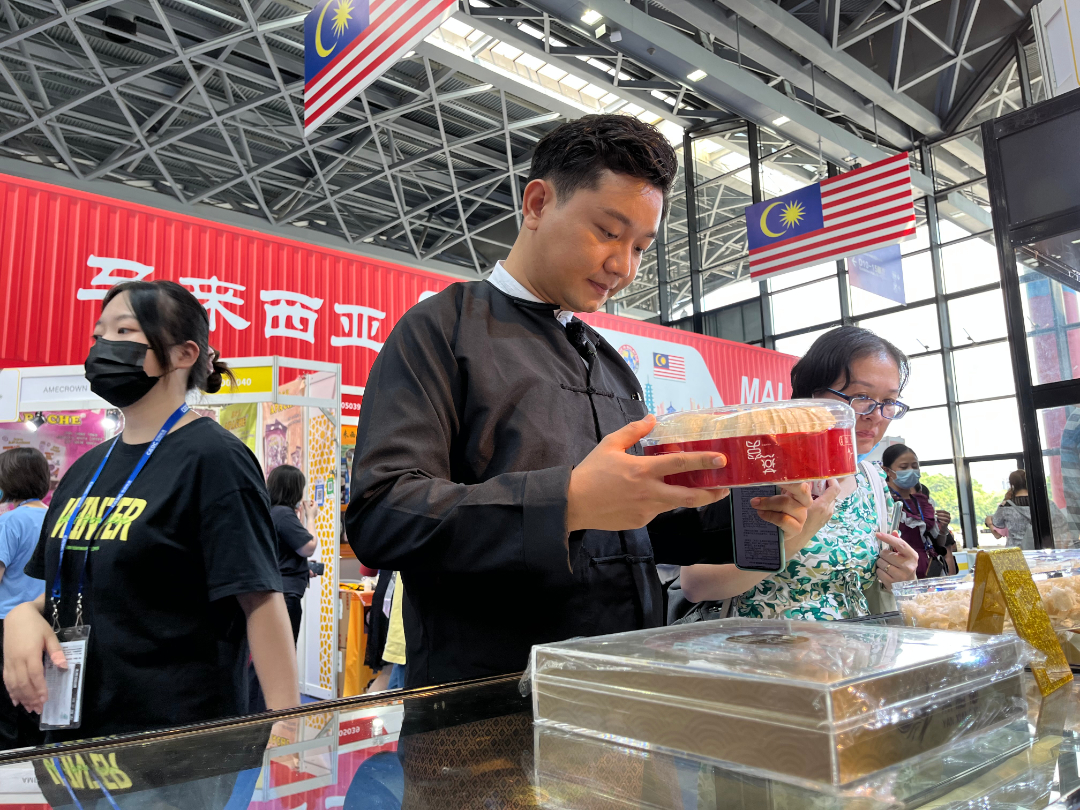 馬來西亞出任本屆東博會主題國,在其展區內展示了豐富多樣的馬來西亞特產。藺英振帶我們來到的第一站就是馬來西亞館。