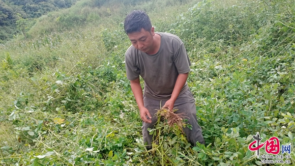 (段王強在地里收黑皮花生。李嶺杰攝)