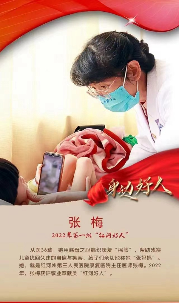 張梅,云南省紅河州第三人民醫院康復醫院主任醫師,醫院里的孩子們都親切的稱呼她為“張媽媽”。從醫36年,她秉持著醫者仁心,通過專業精湛的康復醫療技術在健康中國的紅河實踐中,推動了紅河州殘疾人康復事業的進步與發展。