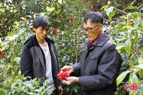 清晨的小山村,薄霧籠罩,清脆的鳥鳴聲回響山谷,朵朵山茶迎風綻放,層層花瓣嬌嫩淡雅,色似胭脂、艷若桃李。一大早,蘭成新就穿梭在紅花綠葉間,十年如一日地呵護著自己栽培的每一株山茶。