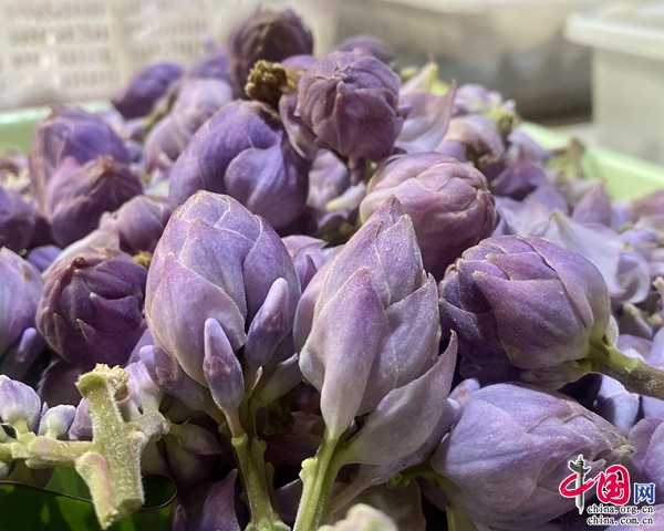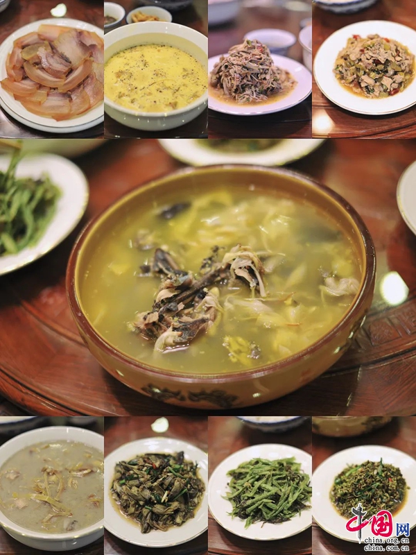 餐桌上,晶瑩剔透的臘肉裹挾著野菜的鮮香與被浸透了臘肉咸香的野菜相輔相成;裹上蛋液,經過油溫浸潤的瓜花酥香可口;將水芹菜洗凈,按著喜歡的口味撒一點鹽、辣椒、蒜末,隨意一拌便又是一道不可多得的美味......臘肉炒香椿、炒水蕨菜、臭菜煎蛋、炒芭蕉花、炸炮仗花、涼拌水芹菜......各色時令野菜在春分時節被紛紛被搬上了桌,脆爽與清香在口中不斷交織,成為人們舌尖上不可或缺的“春天”。