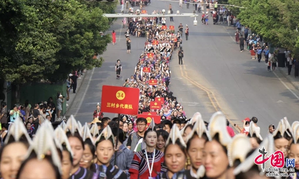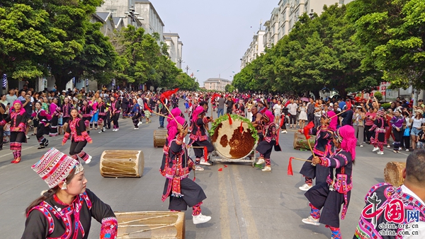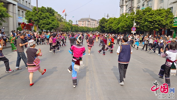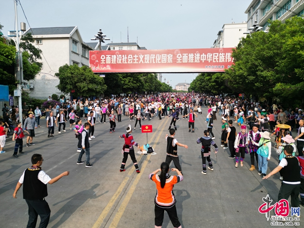 4月23日,云南省紅河州紅河縣舉行“萬人樂作舞”表演活動?;顒蝇F場,由哈尼族、彝族、漢族、傣族和瑤族等民族組成的上萬名樂作舞表演者身著紅河特色的各式民族盛裝,把整條蓮花路妝點得五彩斑斕,成了人們展示各式民族服飾和民族風情的大展臺。