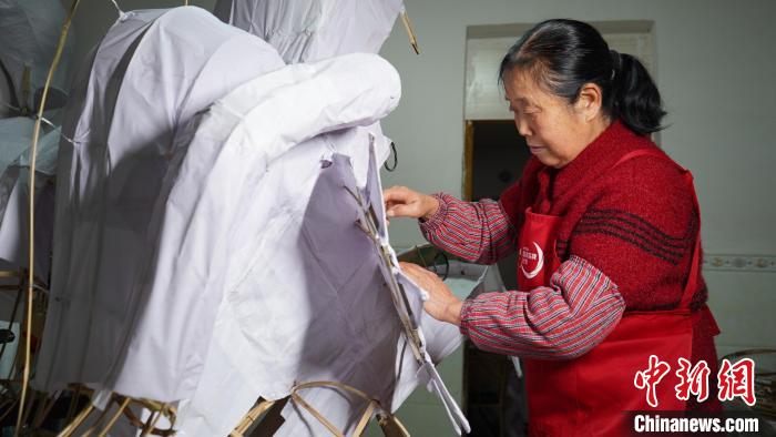 民間手藝人劉裔松的妻子幫忙一起制作龍燈頭。楊廷雪攝