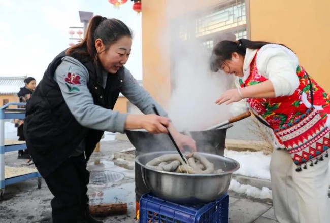 在東北農村,年底有殺年豬的習俗,家家戶戶互相幫忙,一場慶祝豐收團圓的“交響曲”就此唱響。分年豬、灌血腸……大鐵鍋里美食翻滾,鄰里、游客們共同體驗東北特色“殺豬菜”、包餃子,其樂融融。