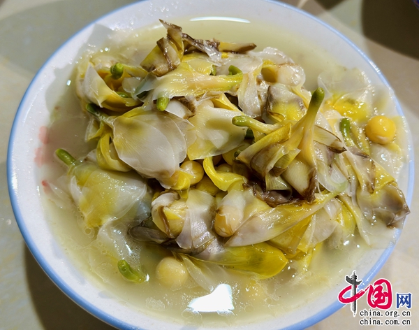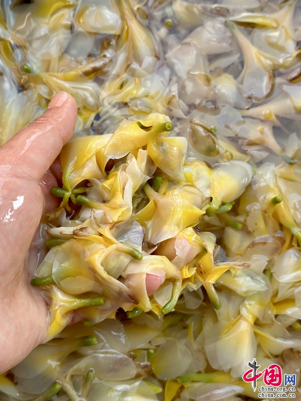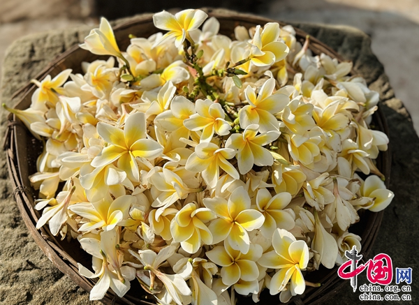 在底土村,生長了百年的雞蛋花樹默默見證了一代又一代人的生生不息,深深長在了人們心中,變成一種情感的寄托,讓人們在其間尋到生活的樂趣以及對美好未來的向往。散落的花朵經清水洗凈,柔軟香滑,或順水煮一鍋豆米雞蛋花湯,或加入紅椒爆炒一盤鮮辣雞蛋花,底土村的人們在賞花吃花中度過一個個唯美的夏季。