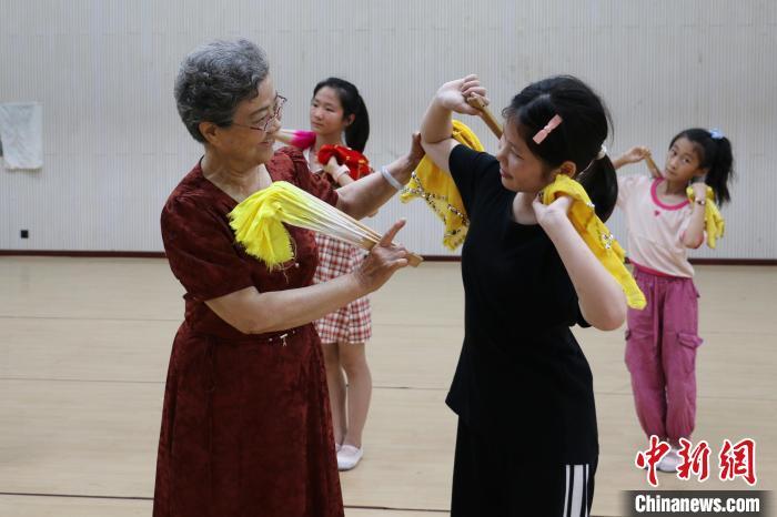 6月25日,中國國家級非物質文化遺產代表性項目花鼓燈(鳳臺花鼓燈)國家級代表性傳承人鄧虹(左一)在指導學生做花鼓燈舞蹈動作。(鳳臺縣委宣傳部供圖)