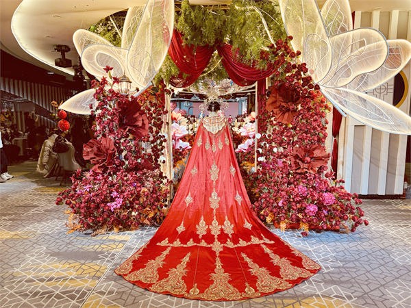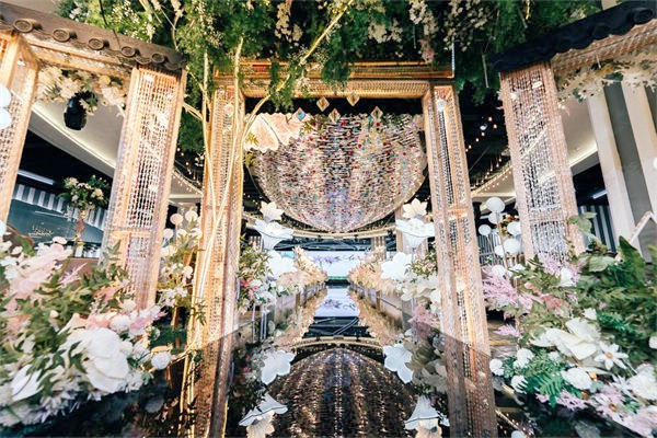 盛大華麗的“慶典廳”能容納400人就餐,大廳中央的走臺兩側盛放著象征純潔愛情的花朵,加上穹頂的燈光效果,整個大廳顯得絢麗多彩,雍容華貴?!懊利悘d”可容納200人就餐,通過精心的裝飾,整個大廳透著十足的現代藝術美感,步入大廳,仿佛走進了花叢中,再加上燈光的變幻和音樂的伴奏,營造出一種如夢似幻的意境?!皭矍閺d”更是別出心裁,這個可容納150人就餐的大廳,古樸莊重中又透著溫馨和浪漫的情調,不僅走臺兩側花團緊簇,穹頂上也插滿了花束,無數人在這里“執子之手”,開啟“與子偕老”的漫長人生?!捌孥E廳”可同時容納100人就餐,大廳中央的步行臺在彩燈的映照下璀璨奪目,兩側花束交相呼應,呵護一對璧人緩步走來,接受雙方親友的祝福,見證一幕幕愛情的奇跡?!跋矏倧d”盛滿濃濃的喜悅,是舉辦生日宴、升學宴和賀壽宴最適宜的場所,可同時容納200人就餐活動。