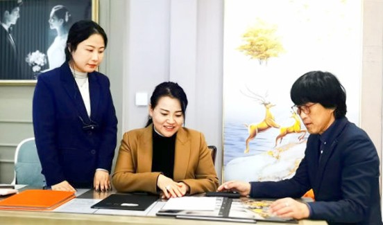 延吉萬達廣場喜樂匯公司董事長崔成云(右)與總經理姜善美(中)研究工作