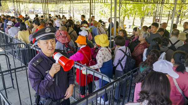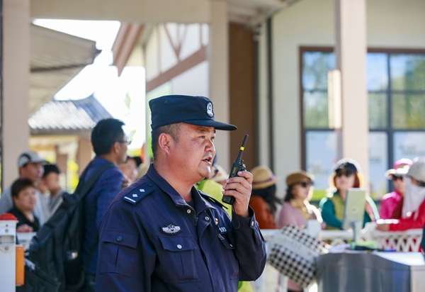 (民警在觀光車乘坐點維護秩序,進行安全提醒。楊根蔚攝)