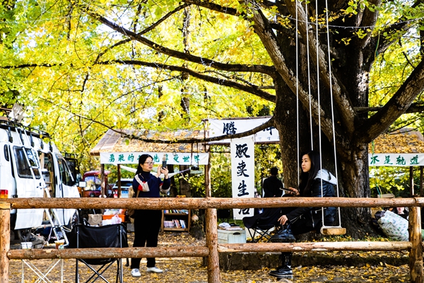 (游客在銀杏村休閑娛樂。勞海山攝)