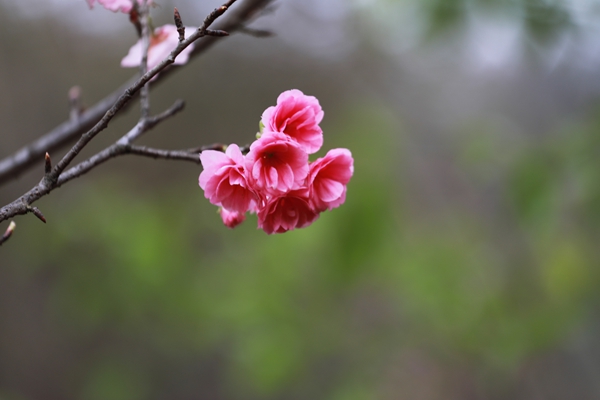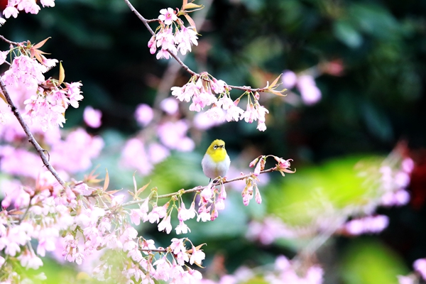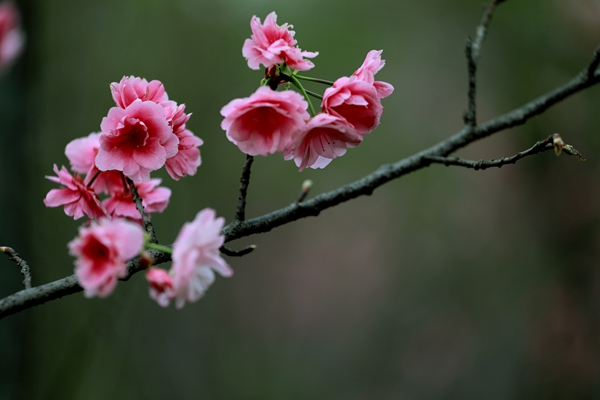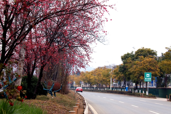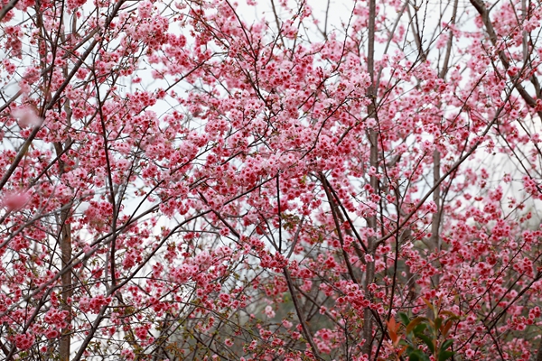 在景區貓貓沖、七零新村的道路沿線,一簇簇冬櫻花在枝頭搖曳生姿,如粉色云霞般絢麗。