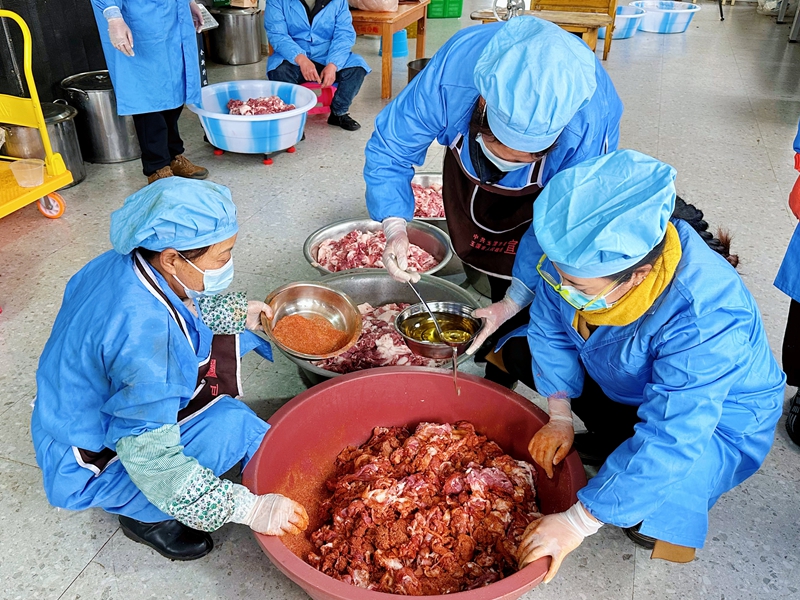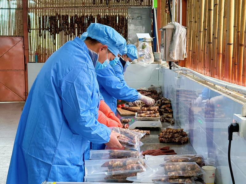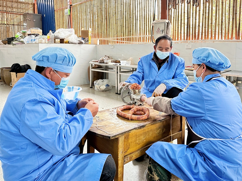 春節臨近,黃草壩村的村辦公司——玉溪高寒綠特農業發展有限公司訂單量持續增加,工作人員早早便開始忙碌起來。切鮮肉、調佐料、腌臘肉、洗腸衣、裝香腸……每一道工序都堅持純手工制作,腌制出的臘味既新鮮又保留了原始醇厚的口感,這便是黃草壩臘味走俏市場的“秘訣”所在。腌好的香腸臘肉經自然風干后,便可分裝打包,搭配其他土特產品裝盒銷售。