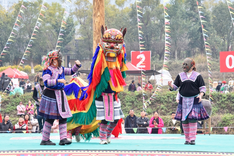開幕式上,苗族兒女身著絢麗多彩的民族服飾,用歡快的蘆笙舞和熱情洋溢的歌舞表演,迎接來自四面八方的群眾和賓朋?;顒蝇F場,蘆笙悠悠,舞步靈動,展示出濃郁的民族風情。舞蹈《鬧花桿》生動再現了苗族同胞熱鬧踩花山的歡樂場景,《石榴結籽開滿花》則以藝術形式詮釋了民族團結的深厚主題,贏得臺下陣陣掌聲。