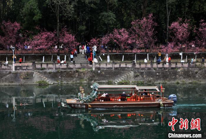 2月10日,四川省成都市錦江河畔的紅梅綻放,吸引市民前來踏春賞梅。圖為市民乘船賞梅。中新社記者王磊攝