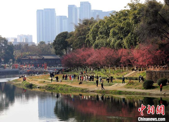 2月10日,四川省成都市錦江河畔的紅梅綻放,吸引市民前來踏春賞梅。圖為市民在錦江邊休閑賞梅。中新社記者王磊攝