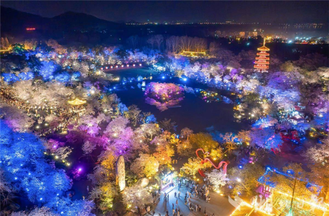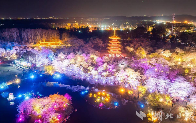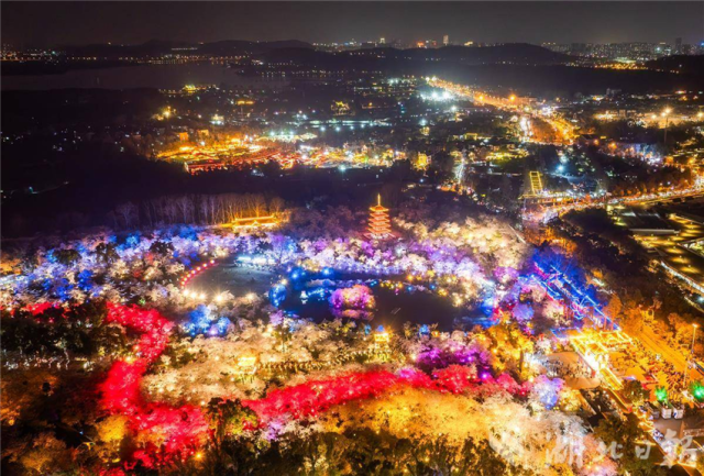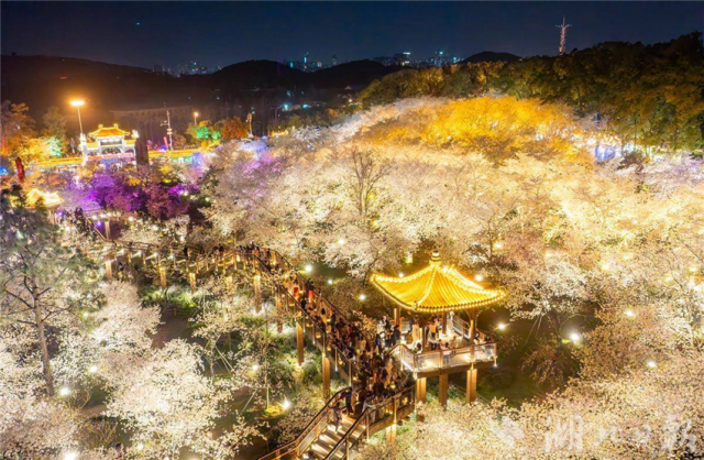 3月25日晚,武漢東湖櫻園,萬余株櫻花在燈光映襯下如夢似幻,游客穿梭其中夜賞櫻花。隨著櫻花進入盛花期,武漢夜櫻在社交平臺上火爆出圈,吸引各地游客組團打卡,感受武漢春天夜晚的浪漫。(湖北日報全媒記者 薛婷 攝)