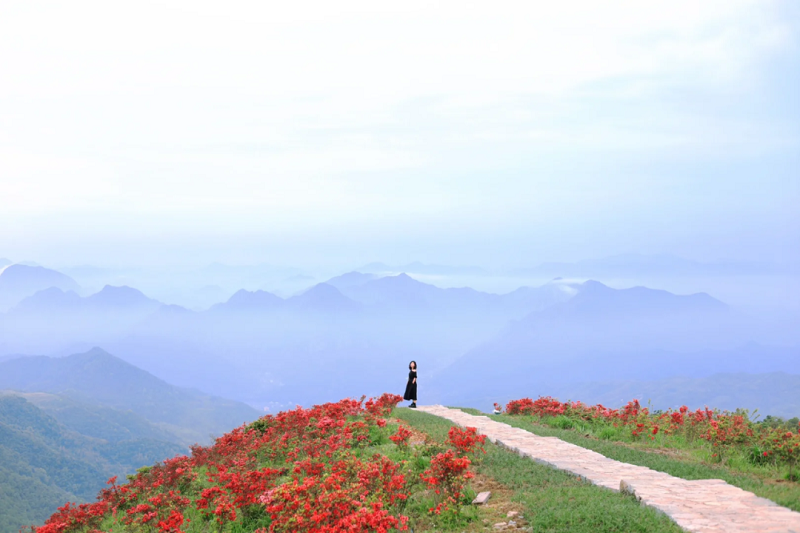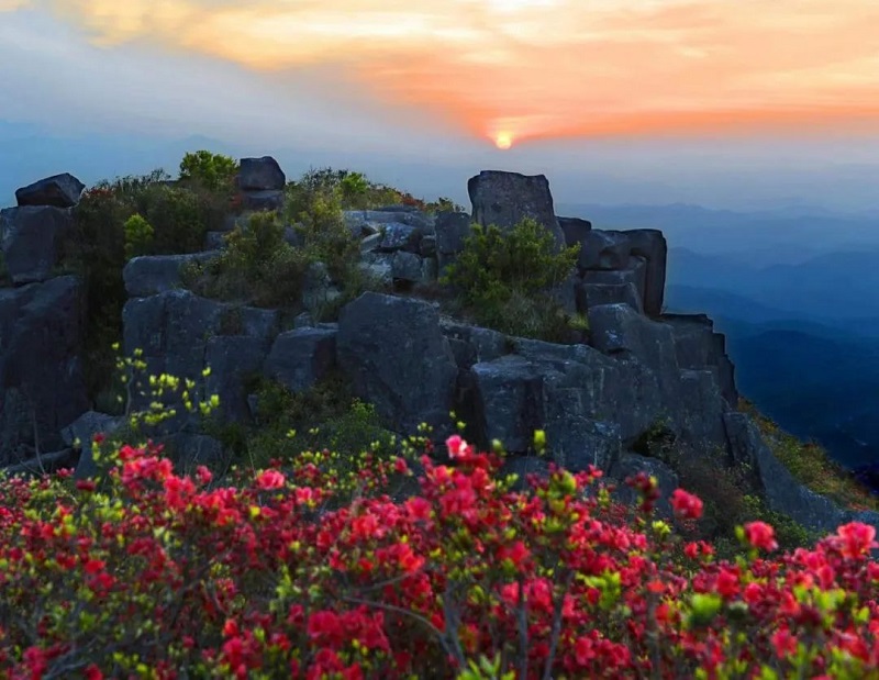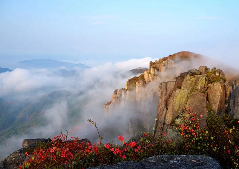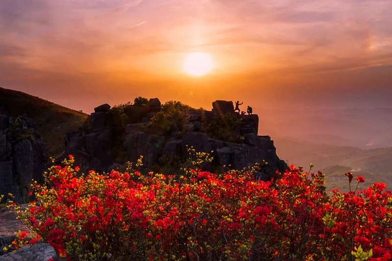 登上頂峰,黛色巨石散布在山間,火紅杜鵑點亮整個春天。若是清晨碰上晨霧,杜鵑在縹緲的霧氣中若隱若現,原本嬌艷的杜鵑瞬間變得溫柔起來。