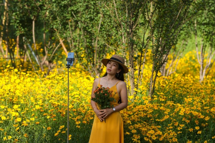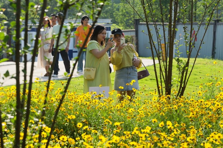 ▲2025年5月12日,江北區塔山公園,盛開的金雞菊迎來眾多市民拍照、打卡。記者 尹詩語 攝