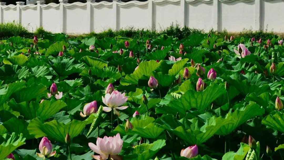 荷花、荷塘與白墻相映成趣