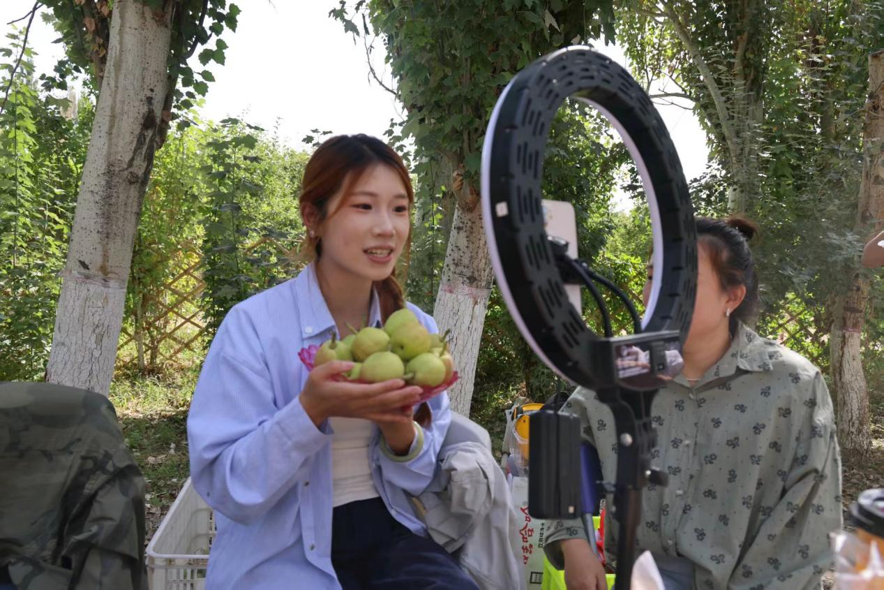 “家人們過來看呀,這個富硒香梨剛從樹上摘下來,咬一口爆汁,現在下單還能領優惠券!”在直播帶貨區,主播正拿著香梨對著鏡頭展示自家果園產的香梨。