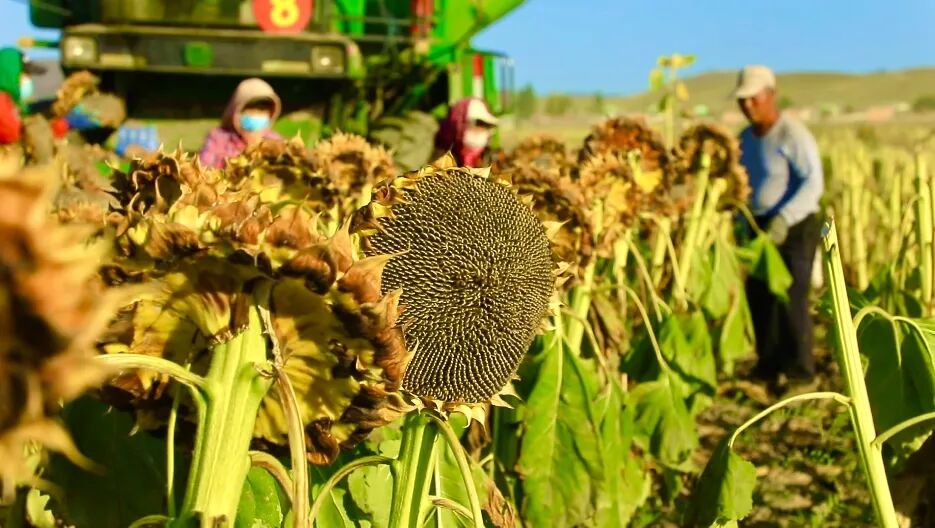 托里縣的葵花田里,藏著“焦糖棕”的驚喜。圓盤狀的葵花盤上,密密麻麻擠滿了葵花籽。農戶們戴著草帽,先割下葵花盤,再用機器剝離籽實,晾曬后的葵花籽無論是直接嗑食,還是榨成香油,都帶著陽光曬過的醇厚香味。
