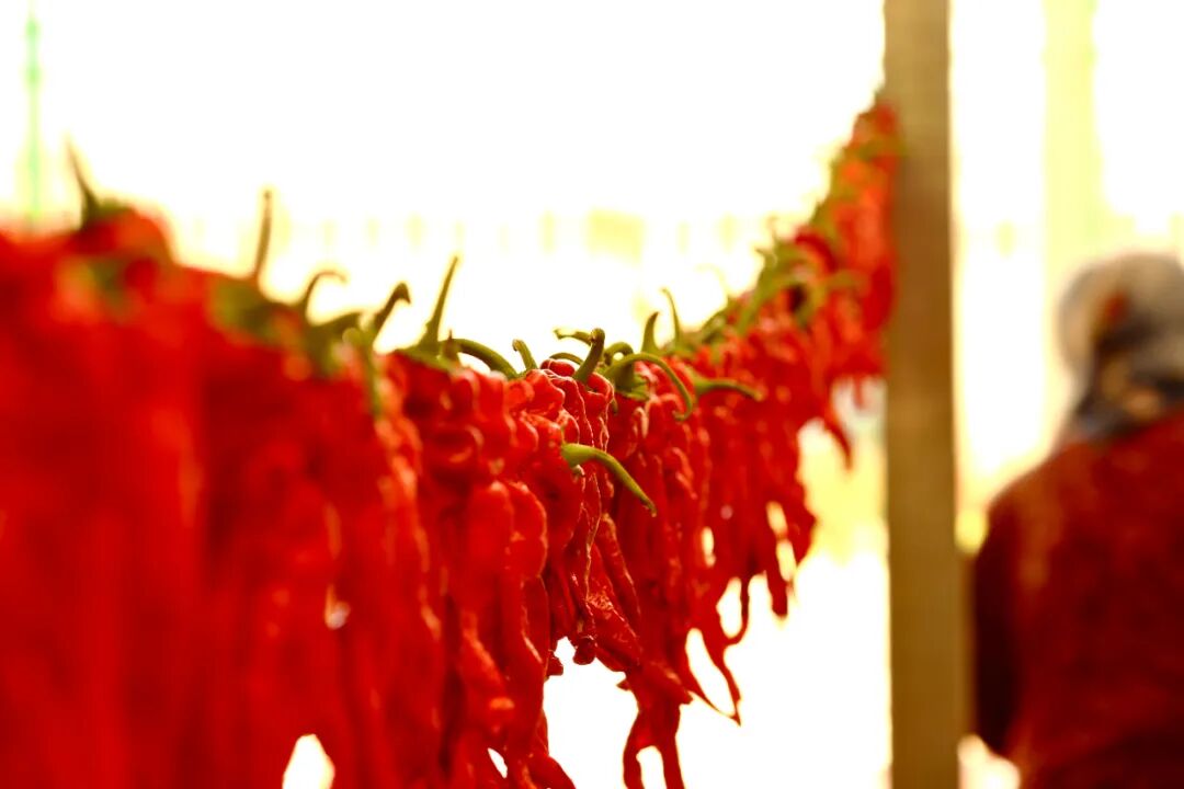 細長的線椒、飽滿的菜椒,紅得熱烈、艷得奪目。農戶們將采摘的辣椒串成串,掛在屋檐下晾曬,風一吹,一串串“火焰紅”輕輕晃動,不僅是冬日調味的佳品,更成了農舍里一道喜慶的豐收風景。