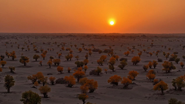 達里雅布依沙漠中的胡楊林,在落日的映照下,宛如被點燃的金色火焰,熱烈而璀璨。人們從四面八方慕名而來,踩著沙土,穿梭在胡楊林間,有的駐足欣賞,有的用相機定格這瞬間。