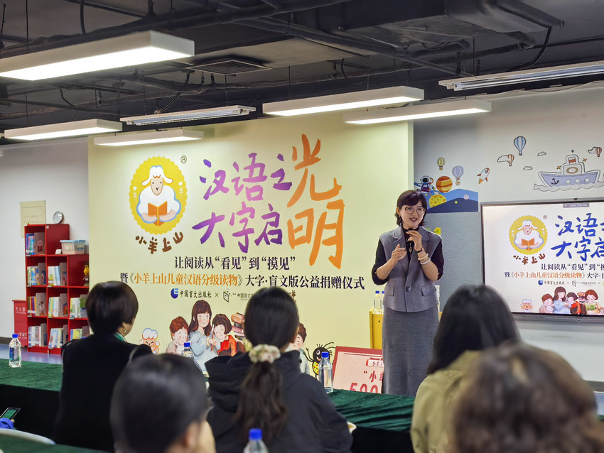 10月15日國際盲人節,《小羊上山兒童漢語分級讀物》大字盲文版公益捐贈儀式在中國盲文圖書館舉行。當《小羊上山》執行主編許立春第一次觸摸到剛剛印制好的這套樣書時,她說:"這就是我們一直在尋找的答案。"