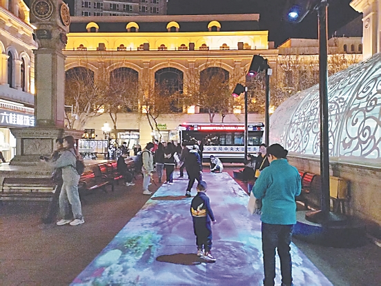 為給市民和游客打造互動空間,日前,互動投影燈在哈爾濱中央大街多條輔街亮相。春有落英繽紛,夏現荷塘月色,秋映金葉翩躚,冬呈雪韻冰情……互動投影燈將四季美景投射于中央大街輔街,市民和游客只需簡單互動,便可觸發光影變幻。